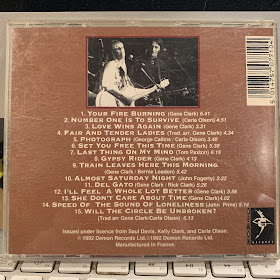 When it arrived, I quickly scanned the back cover to check out the songs Gene and Carla has performed that evening. "Your Fire Burning" made an impression on me before I'd even heard it. For starters, it struck me as odd that Gene and Carla opened the show with a brand-new song (assuming the track list was kept intact); secondly, I was intrigued by the time of 6:41. (Note: I would not hear the No Other album until 1993, so the idea of a six-minutes-plus Gene Clark song was foreign to me.) I quickly assumed that the excessive length would be due to introductions, on-stage banter, tuning, etc.